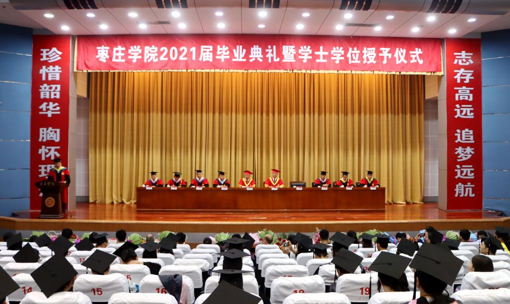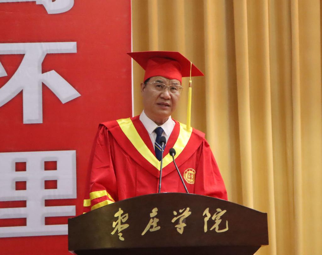 校长李文喜作了题为《激扬青春梦想 展现时代担当》的毕业典礼致辞,代表学校对顺利完成学业的2021届毕业生表示热烈祝贺,并送上三点嘱托和祝福:第一,期待同学们涵养家国情怀,勇担时代使命。热爱祖国、报效祖国同样是每个枣院人的心之所系、情之所归。希望同学们在今后的人生旅程中,能够始终胸怀“国之大者”,始终把自身的“小我”,融入到祖国的“大我”、人民的“大我”之中,让青春在磨砺中出彩、在奋斗中升华,为新时代党和国家事业发展贡献智慧和青春力量。第二,期待同学们勤于修身养德,锤炼过硬本领。完善人格、涵养道德是我们一生必须追寻的目标。同学们唯有保持积极的人生态度,培养良好的道德情操,持续不断地努力学习,才能练就自我发展的强大“内核”、构造自身“硬件系统”,成为新时代国家和民族可信赖、可依靠的“硬核”青年。第三,期待同学们永葆创新精神,争做开路先锋。创新是社会发展的第一动力和永恒主题,也将是同学们建功立业的根本途径。希望同学们今后无论是继续深造还是投身工作,都能始终褒有“敢为天下先”的锐气和甘坐“冷板凳”的定力,把激昂的创新创业梦融入伟大的中国梦,勇攀科技高峰,勇闯科技创新“无人区”,争做创新报国的引领者和实干家。