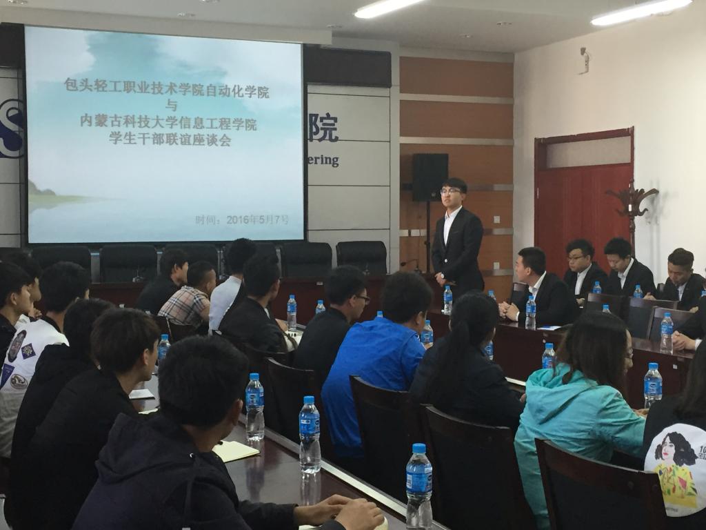 5月7号上午9时,taptap于逸夫楼F302举办了包头轻工职业技术学院自动化学院与taptap点点足彩信息工程学院学生干部联谊座谈会。包轻工学生科科长、团总支书记石永涛老师及两院学生干部参加本次活动。