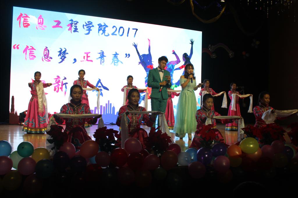晚会丰富多彩的节目类型,立意深刻的节目构思,在观众心中抹上了绚丽的色彩。在观众们热切的期待下,由后海吉他社-拾光乐队与李晓超同学合作的一首歌曲《平凡之路》拉开了晚会的篇章。随之李宁学长献给新生的歌曲《逃》和《你就不要想起我》,优美婉转,打动人心;饱含情肠的17电气学生凭借一首《凉凉》合唱,展现了新生风采,带动了全场气氛;腾飞艺术团学长的一登场,同学们连绵不绝的尖叫,让晚会气氛瞬间达到了高潮,果然,他们的节目情节多变,人物个性鲜明,表演搞笑有趣,大家沉浸之中久久无法自拔。王宇轩等人表演的《非诚勿扰》,欢笑纷呈,结局的突然逆转,令人猝不及防却又不失感动。三位老干部演唱的《将军令》及《泡沫》,热情而又激昂,现场掌声呐喊声此起彼伏,最终一支富有草原独特魅力的舞蹈《请到草原来》宣告晚会圆满落下帷幕。