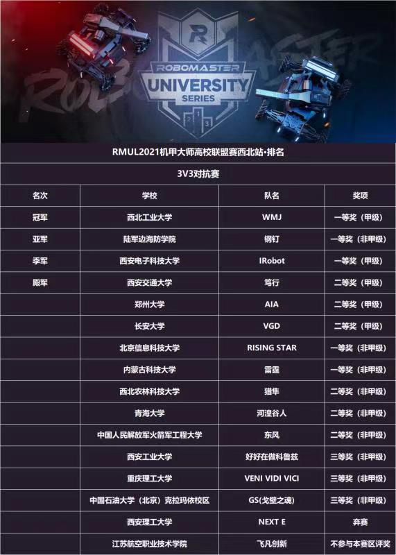 由共青团中央主办,大疆发起、西安交通大学承办的第二十届全国大学生机器人大赛RoboMasters2021机甲大师高校联盟赛(西北站),于2021年4月5日在西安市西部云谷云尚会议中心圆满落幕。赛事吸引了包含我校以及西安交通大学、西北工业大学、陆军边海防学院等众多高校参与,赛事共持续三天。我校雷霆战队过关斩将,并最终取得赛区非甲级一等奖的好成绩。