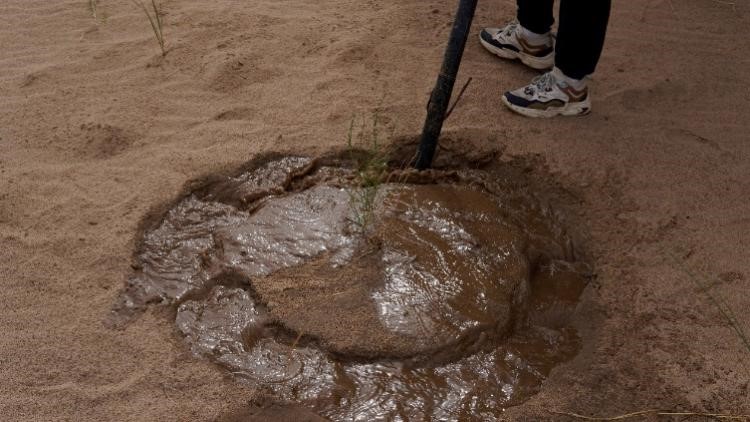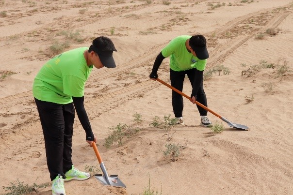 由于沙漠蓄水能力极差,浇下的水很快就无踪影了。为了减少水分蒸发,大家抓紧时间回填水坑,与太阳展开了一场无声的竞赛。因为我们深知早一分钟回填就减少一点水分蒸发,而减少水分蒸发是提升树苗成活率的关键。志愿者们用汗水书写着对生命的敬畏与呵护,同时也体会着治沙人日复一日、年复一年的艰辛,心中不禁迸发出无限的崇敬。