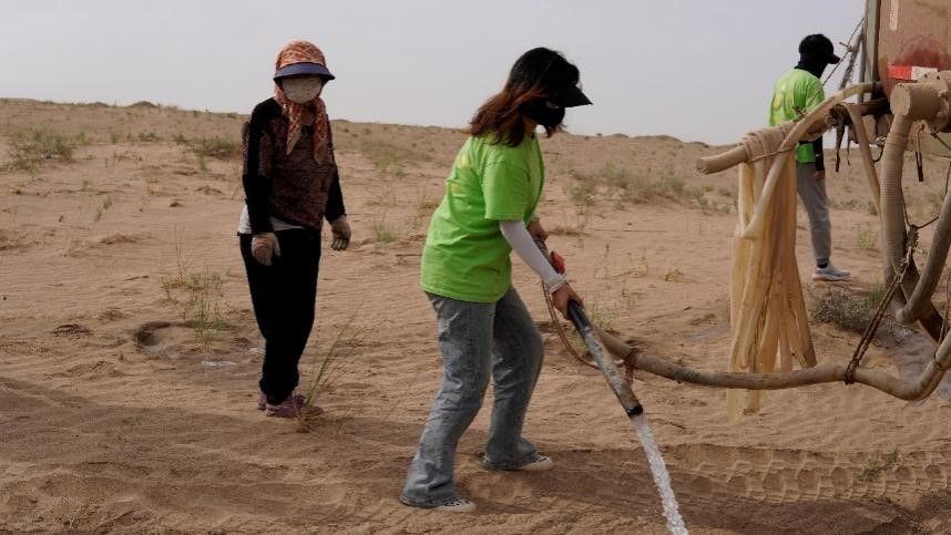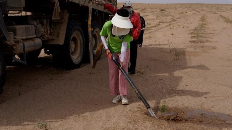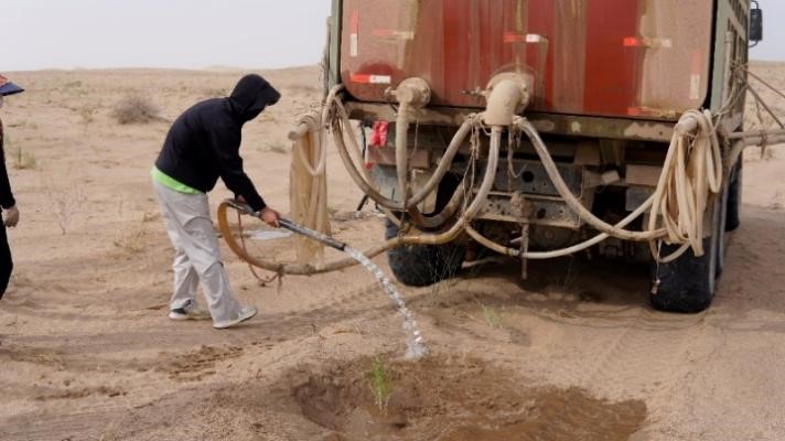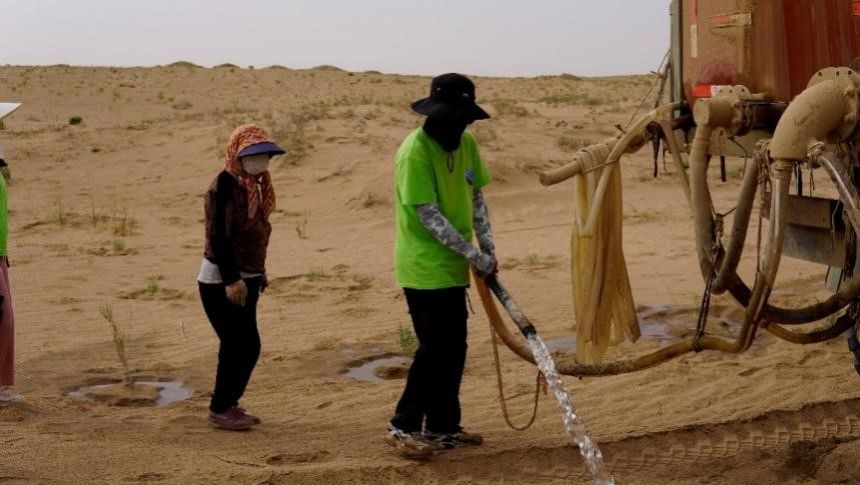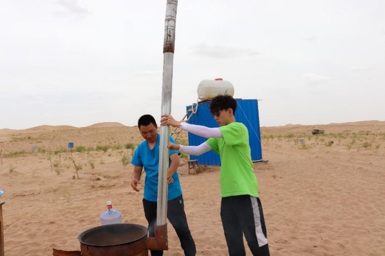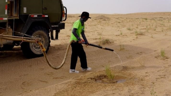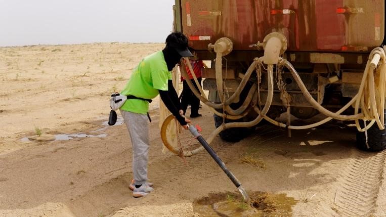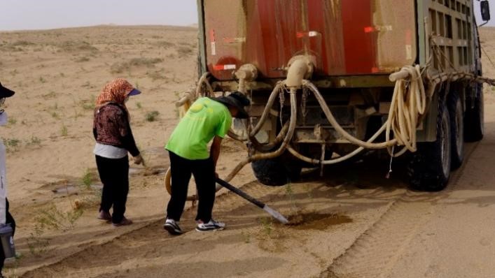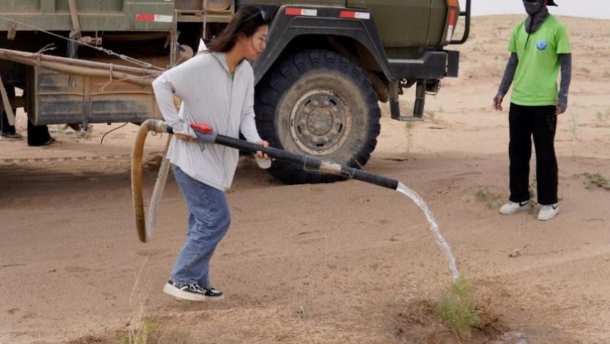 在梭梭树的养护中,浇水是十分重要的一环。实践队员们需要早早起床跟随水车进入沙漠为梭梭树苗浇水。在烈日炙烤下的沙漠,每一滴水都显得尤为珍贵。对于队员们来说,给树苗浇水是一个技术活,既要掌握阀门不浪费一滴水,又要注意距离不冲出树根。在几次尝试后,队员们终于能浇出最规范科学的水坑了。