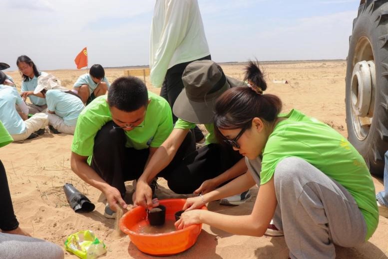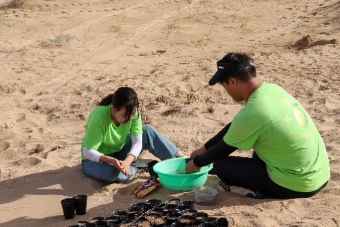 实践队员积极开展杯苗试验,体验防风治沙最基础的一步——让梭梭树由种子变成小树苗。杯苗试验也是沙漠绿化和生态恢复领域的一项重要实践。