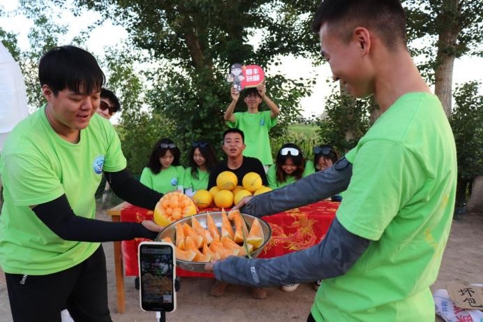 实践队员在沙漠基地负责人仲麟组织下,开展了一次激情满满的直播。有一次直播经验的“小青柠”专业团队即将带来“专业直播”。为让民勤蜜瓜卖得更好更多,每个人都使出浑身解数。徒手撕瓜,“顺丰包邮!坏果包赔!民勤蜜瓜!嘎嘎甜!”一遍遍的卖力喊着口号,一遍遍讲解着蜜瓜的香甜软糯,解答着直播公屏上的问题。单场直播带来近50万点赞量及近8000单销量。