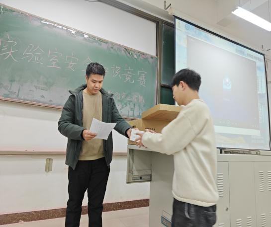 经过激烈角逐,最终评选出2名一等奖、3名二等奖以及5名三等奖获得者。赵文涛老师为获奖选手颁发奖品,向未获奖的同学发放纪念品,并着重指出,实验室安全与每一位师生的生命安全、科研工作及教学活动紧密相连,至关重要。全体师生必须时刻保持高度警惕,牢固树立“安全第一”的理念,将安全意识贯穿于实验操作的每一个环节,确保实验室安全万无一失。